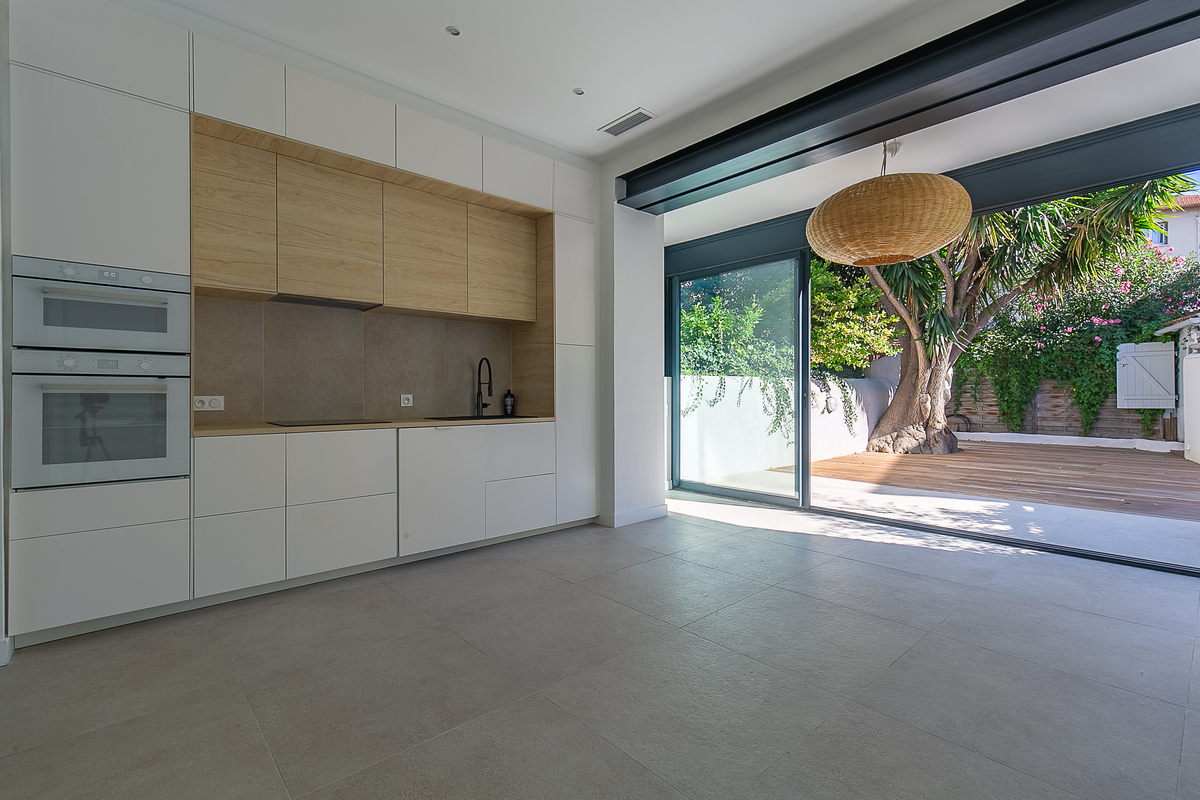 En rez de chaussée, le grand séjour traversant avec cuisine ouverte donne sur le très agréable petit jardin paysager.